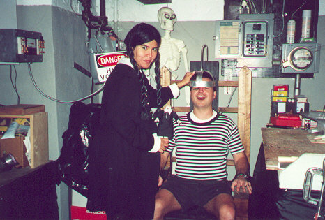 Uncle Fester trying out "Old Sparky". The light bulb, cast in hot glue, had a contact switch that was activated by Fester's tongue. The electric chair was hooked up to a strobe light and a sound fx tape.